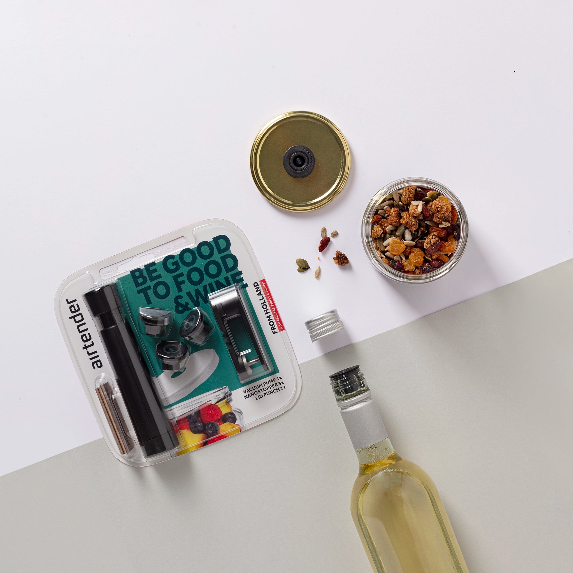 Us the Lid Punch to simply make a hole in the jar lid, place a Nanostopper and create a vacuum with the Airtender vacuum pump. Or use only the Nanostopper to vacuum seal a wine bottle and keep wine fresh up to 5x longer.